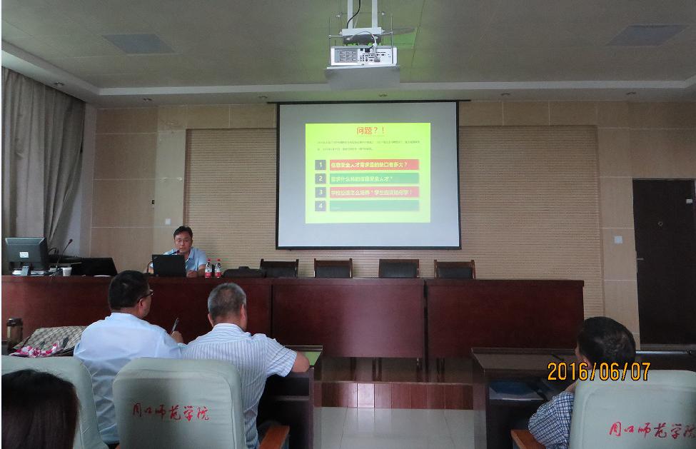 6月7日下午,南阳理工学院软件学院段新东博士应邀来我校讲学,在综合实验楼425会议室作了题为《信息安全应用型人才培养的思考》的报告。报告会由73882必赢网页版院长李亚主持,73882必赢网页版100多名师生聆听了报告。 报告会上,段新东博士首先对信息安全人才培养的形势及信息安全人才培养的定位进行分析,然后对南阳理工学院软件学院的培养方案设计与实施进行介绍,最后提出特色点与不足的观察与思考。 段博士精彩详细的讲述、严谨的论证,对信息安全应用型人才培养定位明确,使参加报告会的师生受益匪浅。