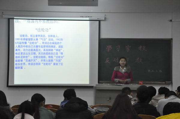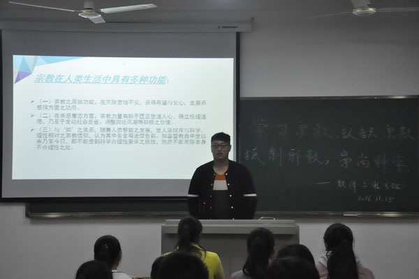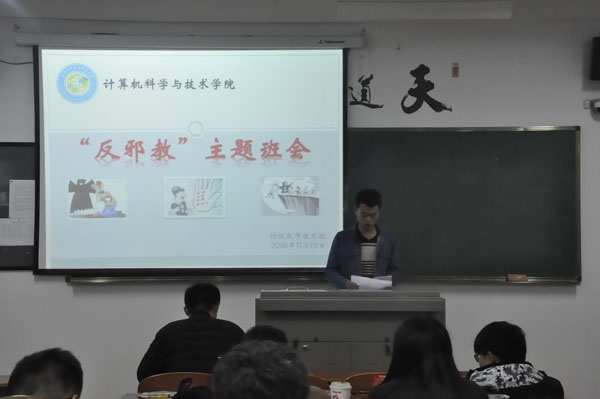 为了使同学们进一步提高识别、抵御和有效防范邪教的能力;培养学生正确的世界观、人生观。2016年11月15日,计算机学院各班于教学楼举行了以“学习宗教,认识宗教,崇尚科学,反对邪教”的主题班会。 本次班会,各班班委认真负责,各司其职,通过一个个鲜活的事例,使同学们对邪教的本质有了深刻的认识。了解了宗教与邪教的区别,并系统地介绍了抵制邪教的方法。最后各班班长号召同学们在自己反对邪教的同时,要关心他人,不要让邪教危害到自己身边的同学、朋友和亲人。同学们也纷纷发言,表达了自己反对邪教、崇尚科学的决心。最终所有的同学形成一致共识:崇尚科学、健康生活、拒绝邪教。 通过这次的主题班会,同学们不仅认清了邪教的本质及其严重的社会危害性,而且进一步提高了识别邪教、防范邪教、与邪教作斗争的能力。在今后的生活中,相信同学们一定会从自我做起,从现在做起,从点滴开始,积极学习科学文化知识,为家庭的温馨和社会的和谐而共同努力!