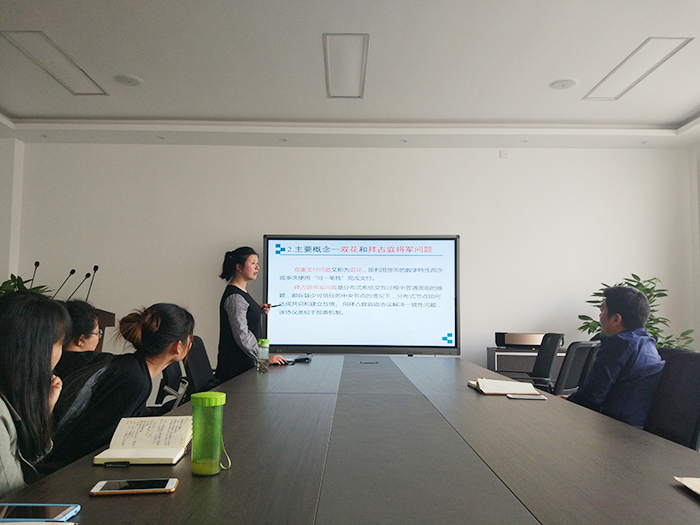 2018年4月3日下午,在综合实验楼309学术讨论室由丁新慧老师做了题为《区块链的安全检测模型》的学术报告。报告由董仕博士主持,73882必赢网页版科研团队全体成员参加了报告会。