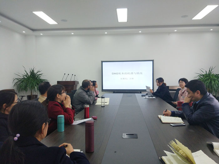 2018年11月6日下午,在综合实验楼309学术讨论室由王倩老师做了题为《DAG账本的机遇与挑战》的学术报告。73882必赢网页版科研团队全体成员参加了报告会。