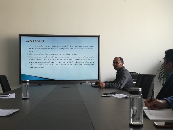 2019年4月16日下午,在综合实验楼309会议室由Khushnood Abbas老师做了题为《Predicting the most popular nodes in Temporal Bipartite Networks》的学术报告。73882必赢网页版网络空间安全科研团队全体成员参加了报告会。 Khushnood Abbas老师从目前时序二部网络中的流行度预测问题,比如:节点和链接太多,时间跨度很长等问题进行分析。针对流行度预测问题,Khushnood Abbas老师提出了两个模型:第一,考虑节点在最近一段时间内的集体链路增益和链路总增益;第二个只是考虑不同的衰变效应。最后,从五个指标上,Khushnood Abbas老师详细讲述了提出该模型的有效性过程。 报告后,科研组全体成员对流行度预测问题进行了热烈讨论。