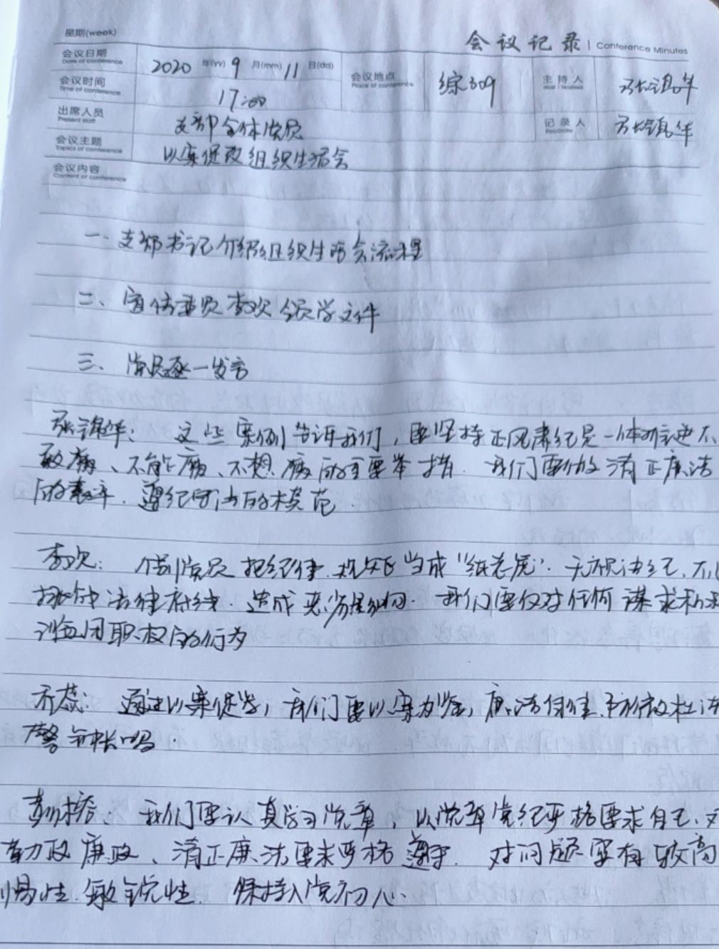 9月11日下午,73882必赢网页版教师第二党支部在综合楼309室开展了以案促改组织生活会,党支部书记张锦华同志主持会议,党支部全体党员参会。 会上,党支部全体党员集体学习了学校关于召开以案促改专题组织生活会的通知内容。 随后,党支部书记带头作个人对照检查,发言完毕,其他党支部委员与普通党员逐一对其开展批评,党支部书记表态发言;党支部委员逐个作个人对照检查,发言完毕,其他党员逐一对其开展批评,党支部委员表态发言;党支部党员依次作个人对照检查,其余人员逐一对其开展批评,党支部党员表态发言。 张锦华同志总结指出,此次“以案促改”专题组织生活会意义重大,警示性强,达到了压实责任、以案为鉴、强化党性、促进发展的目的。她就持续抓好“以案促改”各项工作落实对全体党员提出要求,一要提高政治站位,落实“以案促改”各项工作任务;二要加强责任心,做好本职工作;三要切实联系实际,坚决抓好整改落实,防范违纪违规;四要以此次“以案促改”会议为契机,凝聚全体党员共识和力量,为学院教育事业作出贡献。
