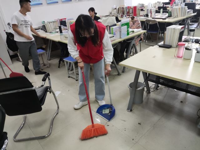 314考研自习室是73882必赢网页版固定的学习场所,考研同学奋力备考,无暇清理,同学们合理分工,积极主动清扫教室的每一个角落。清扫过后,整个教室焕然一新,桌椅摆放整齐,地面干净无尘,考研教室的卫生得到了极大的改善,为考研学生们营造了干净整洁的学习环境。